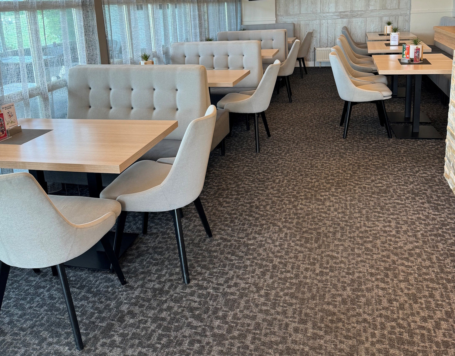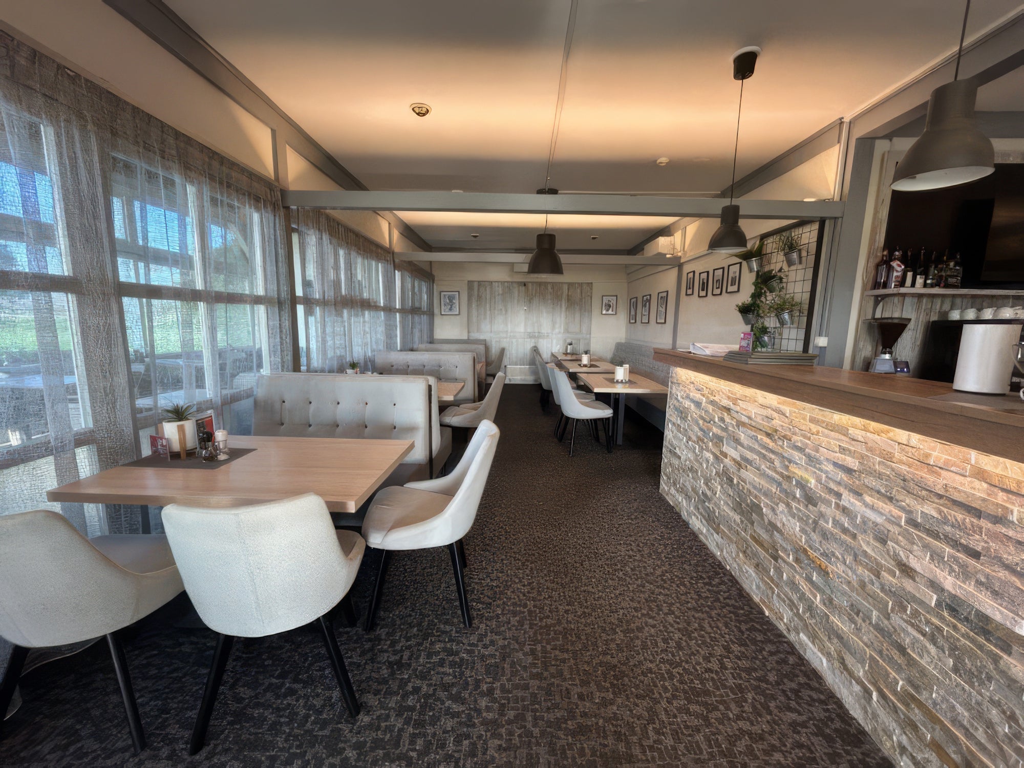 Die eleganten Tischgestelle Ecco 1, Ecco 2 sowie Colorado 1 & 2 wurden gemeinsam mit den hochwertigen HPL-Tischplatten Royal umgesetzt und bieten eine langlebige, pflegeleichte und optisch ansprechende Lösung für den intensiven Gastronomiealltag. Ergänzt wird das Raumkonzept durch die Gastro-Bank Melrose, die mit ihrem modernen Design und hoher Sitzkapazität überzeugt.